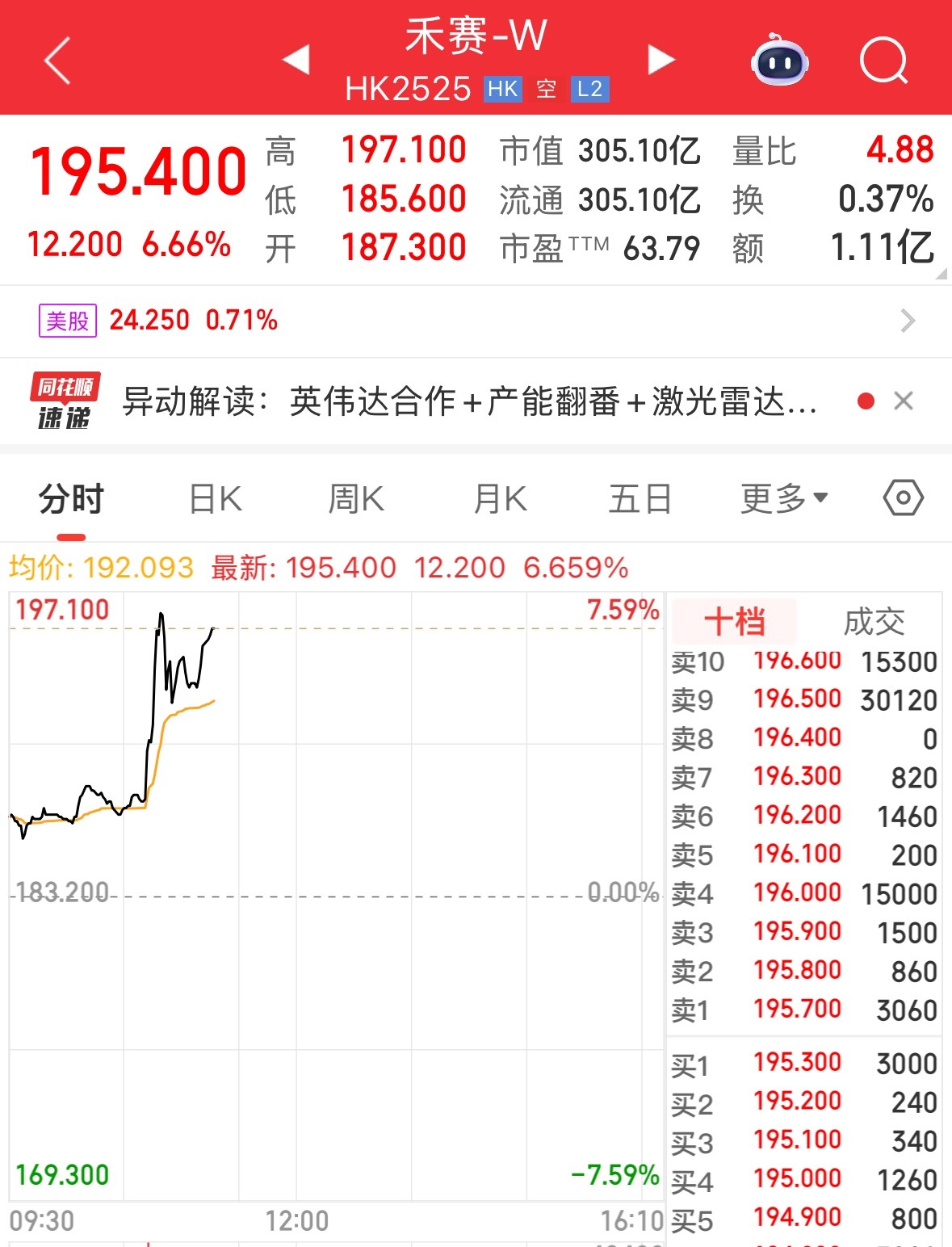 市场方面,港股禾赛直线拉升,截至发稿股价上涨6.66%。