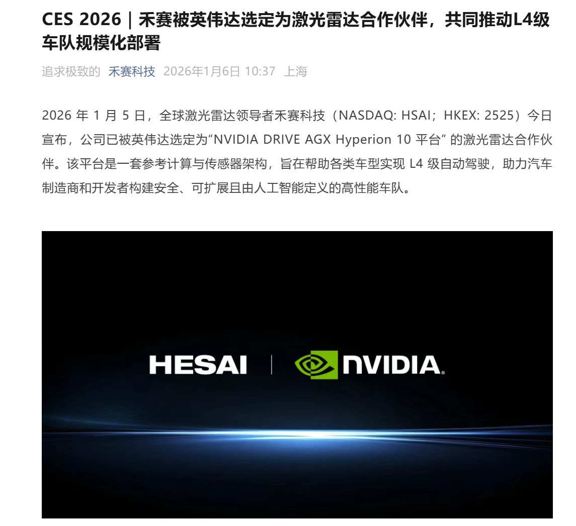 1月6日,禾赛科技通过公众号宣布,公司已被英伟达选定为“NVIDIA DRIVE AGX Hyperion 10平台”的激光雷达合作伙伴。该平台是一套参考计算与传感器架构,旨在帮助各类车型实现 L4 级自动驾驶,助力汽车制造商和开发者构建安全、可扩展且由人工智能定义的高性能车队。