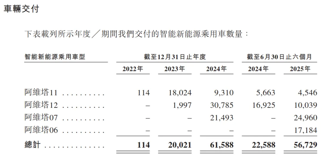2025年前6个月,阿维塔旗下有阿维塔11、12、07、06四种车型,累计交付56,729辆。截至2025年6月,阿维塔累计交付13.8万辆,其中2024年1月开始的18个月中,交付辆约占总交付量的86%。
