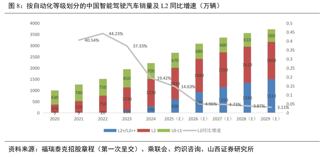 智驾层面,以2024年为例,配备L2级及以上智能驾驶解决方案的汽车销量达到1520万辆,配备特定自动化水平智能驾驶解决方案的车辆销量占车辆总销量的百分比为68.47%,预计至2029年提升至3170万辆,渗透率为84.99%。