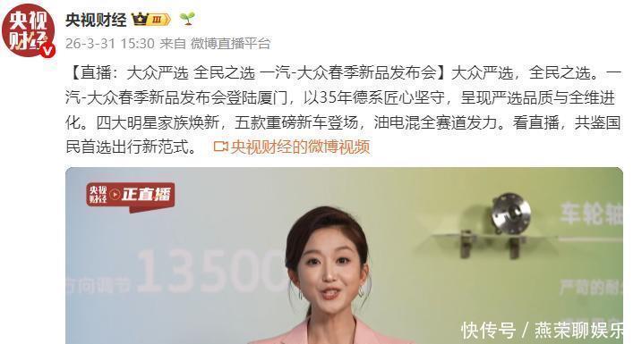 据了解,《大众严选 全民之选——大众春季新品发布会》于2026年3月31号下午15:30在福建厦门进行了直播,本次发布会共推出5款新车型,覆盖燃油与新能源领域,实现油电混动全赛道布局。此次春季新品发布会活动通过线上直播形式面向公众开放,同步呈现线下现场盛况,传递品牌新品与服务理念。